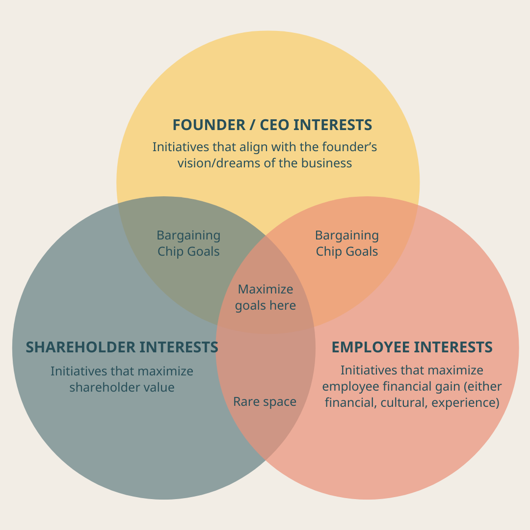 It’s important to recognize this in how you as the founder/CEO manage the goal setting and planning process with your team. It also is important to consider carefully aligning bonus and incentive compensation for these employees to attempt to minimize shareholder/employee conflict in setting and executing on those goals.