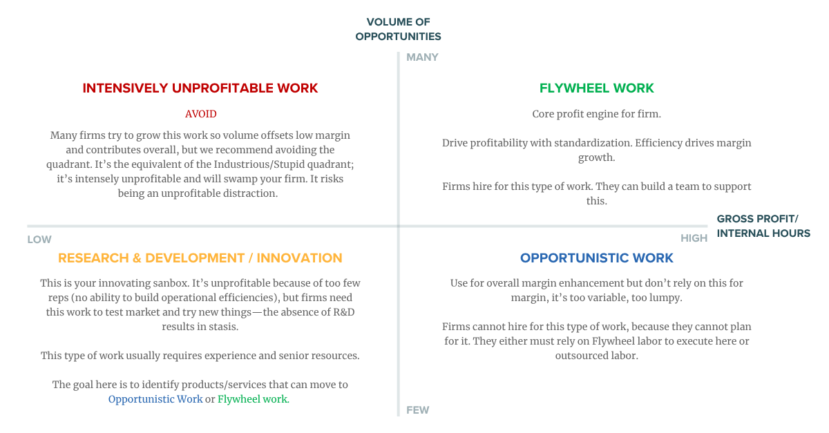 Opportunistic Work: High margin, but inconsistent. Or it could be an engagement that you feel is a worthwhile test. Take it when it comes, but don’t build around it.